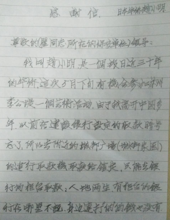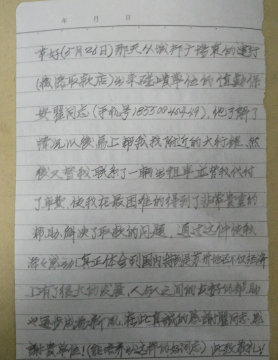 5月下旬,隊(duì)員翟紅衛(wèi)在上班執(zhí)勤期間遇到一位老人求助,老人是位多年的旅日華僑,初到蘇州人生地不熟,急需去銀行取款但又不知道詳細(xì)位置且沒(méi)有攜帶現(xiàn)金。在了解了基本情況之后,隊(duì)員翟紅衛(wèi)當(dāng)即為老人查找了附近的銀行地址并代付了車費(fèi)。
